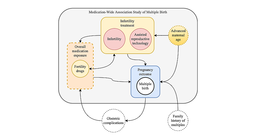 Medication-wide association studies (MWAS) have been applied to assess the risk of individual prescription use and a wide range of health outcomes, including cancer, acute myocardial infarction, acute liver failure, acute renal failure, and upper gastrointestinal ulcers. Current literature on the use of preconception and periconception medication and its association with the risk of multiple gestation pregnancies (eg, monozygotic and dizygotic) is largely based on assisted reproductive technology (ART) cohorts. However, among non-ART pregnancies, it is unknown whether other medications increase the risk of multifetal pregnancies.